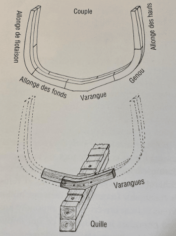 La varangue est le premier élément du couple, c’est-à-dire l’ensemble des pièces qui forment la “côte” du navire.